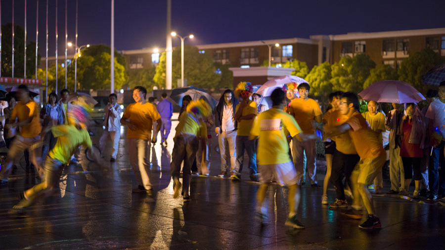 當最后一名夜跑者回到主場地時,天公不作美地下起了雨,而且雨量還不小,但是所有在場人員都選擇了堅持,大家冒雨進行了兩輪激烈的“撕名牌”大戰,僅管因為下雨場地濕猾,大家的熱情與活力卻迸發得更加熱烈,經過三輪角逐,星星家電代表隊摘得本次名牌大戰的桂冠,在主持人宣布這一消息之時,家電全體在場人員在雨中雀躍歡呼,參賽隊員更是揮動著手中的“彩虹頭套”互擁互抱,場面極其壯觀!